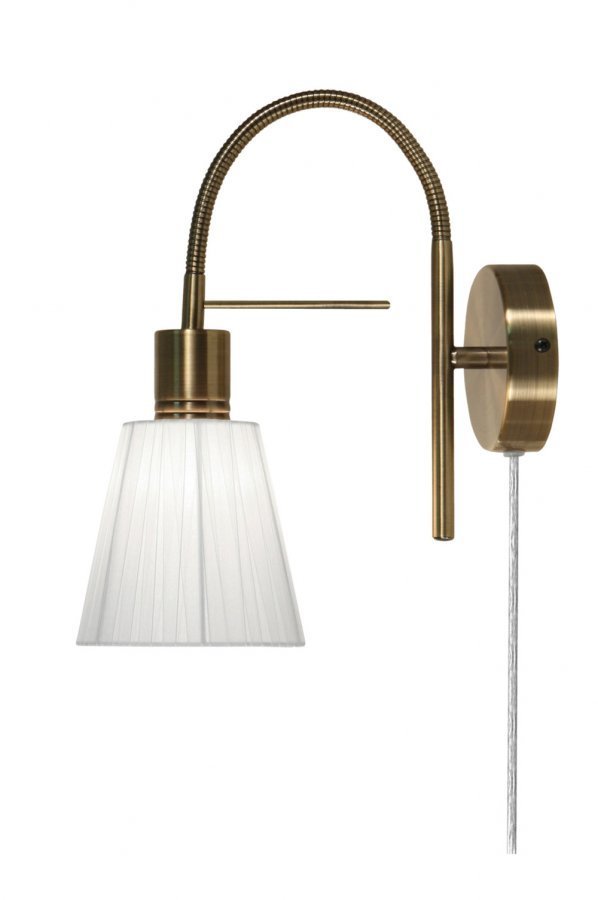 Seinälle kiinnitettävä lukuvalaisin lakattua metallia. Varjostin organzaa. Läpikuultava johto, jossa katkaisin. Korkeus 25 cm. Leveys 12 cm. Etäisyys seinästä 25 cm. Lampunkanta E14. Enintään 40 W.
