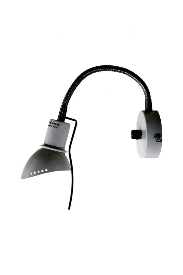 Ingo-seinävalaisin metallia. Kuvussa reikäkuvio. Krominväriset detaljit ja joustava varsi. Läpikuultava johto, himmennin seinälevyssä. Korkeus 14 cm. Etäisyys seinästä 8 cm 17 cm. Lampunkanta GU10. Enintään 35 W (halogeenilamppu ei sisälly toimitukseen). Design: Ingvar Bengtsson.