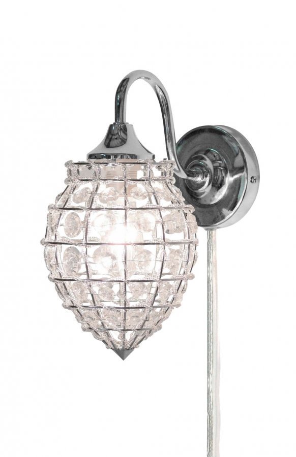Krominväristä metallia. Prismat akryyliä. Läpikuultavassa johdossa virtakytkin. Halkaisija 12 cm. Korkeus 24 cm. Syvyys 20 cm. Lampunpidike E14. Enintään 40W.