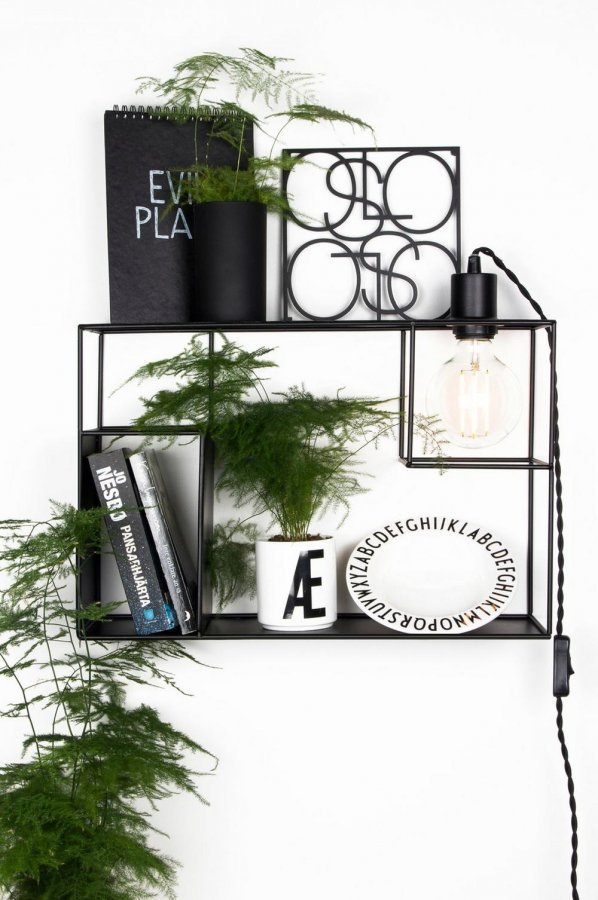 Shelfie-seinävalaisin mattapintaista maalattua metallia. Koristeellinen ja käytännöllinen. Mukana ripustustarvikkeet. Kierretty 3 m:n pituinen kangaspäällysteinen johto, jossa katkaisin. Korkeus 30 cm. Leveys 45 cm. Syvyys 14 cm. Lampunpidike E27 60 W. Lamppu ei mukana. Design: Patrick Hall.