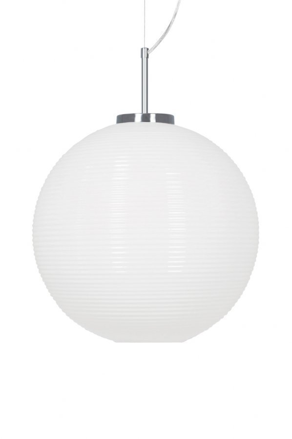 Kattovalaisin valkoista, kuplamaista 30-luvun lasia, joka hajauttaa valoa jännittävällä tavalla. Ripustin ja kattokupu messinkiä. Vaijeriripustus ja läpinäkyvä johto. Korkeus 50 cm, halkaisija 40 cm. Lampunpidike E27, enintään 60 W.