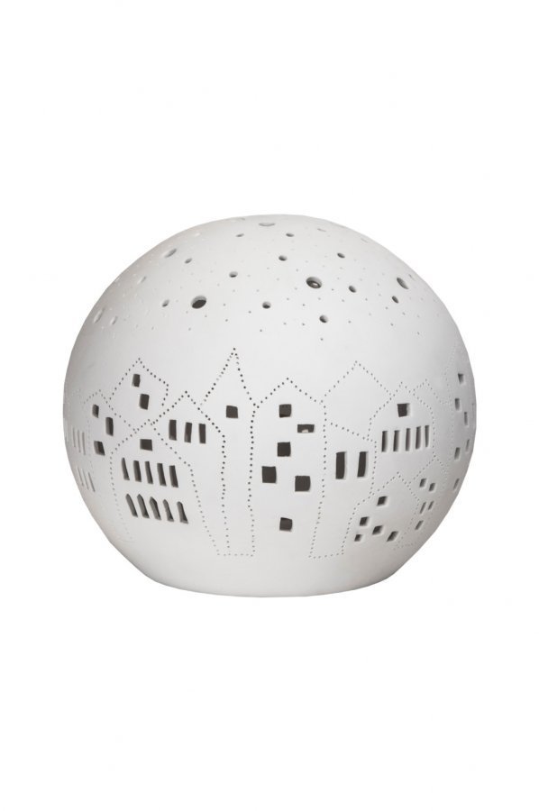 Village on käsin valmistettu keramiikkavalaisin, joka luo huoneeseen kauniin tunnelmallisia varjoja. Rei’itetty kuvio esittää pikkukaupungin taloja tähtitaivaan alla. Korkeus 18 cm, halkaisija 18 cm. Lampunkanta E14. Enintään 40 W. 200 cm:n pituinen läpikuultava johto, jossa katkaisin.