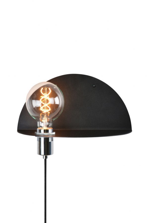Seinävalaisin mustaksi maalattua metallia. Hyllylevy. Krominvärinen lampunpidike ja 200 cm:n musta kangasjohto. Sopii hyvin esim. sängyn viereen yöpöydäksi. Korkeus 13 cm, leveys 30 cm, etäisyys seinästä 15 cm Lampunpidike: E27, enintään 60 W