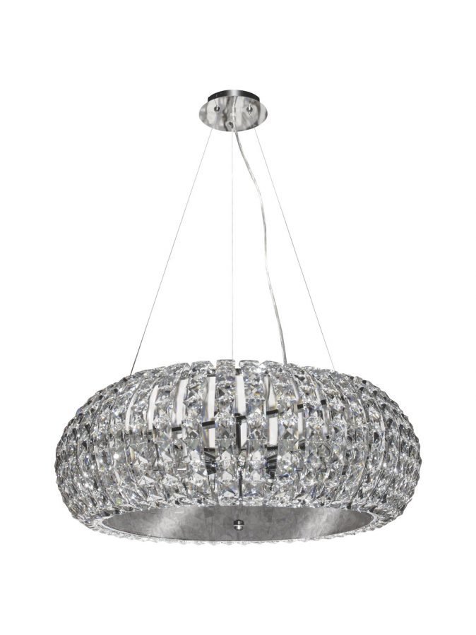 Kotimaisen valaisinyrityksen upean valaisimen materiaali on kromia ja briljanttihiottua kristallia. Polttimo kuuluu hintaan (12 x G9, 40 W). Johdon pituus on 4 m.