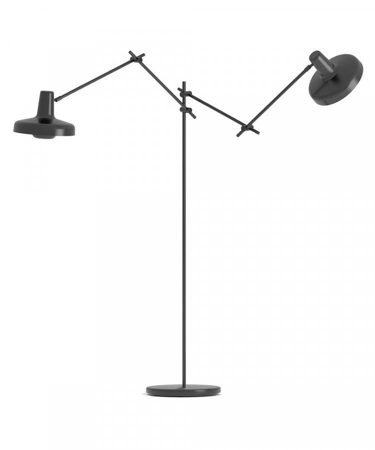 Design: Grupa Products for Lampefeber. Konsepti: Arigato Kaksoislattiavalaisin on korkeudeltaan 109 cm, valaisin tarjoaa tyylikkään Musta designin, ja on valmistettu metallista. Valaisimen varret sekä valaisimen päät ovat säädettävissä, joten voit itse päättää valon suunnan, riippuen omista tarpeistasi. Arigato on funktionaalinen valaisin, joka sopii hyvin moniin tiloihin. Arigato designin takana on hyvin yksinkertainen ilmaisu, moderni ja minimalistinen design. Arigato-sarjaan kuuluvat pöytävalaisimet, lattiavalaisimet, seinävalaisimet ja kattovalaisimet, saatavilla valkoisena ja mustana.