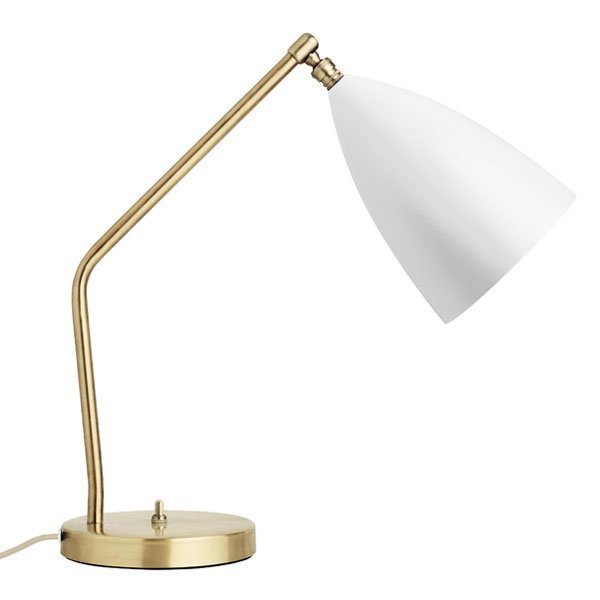Greta Grossmanin suunnittelema Gräshoppa-pöytävalaisin. Messinkinen jalkaosa yhdistyy mattapintaiseen varjostimeen, joka on liikuteltavissa pallonivelen ansiosta.