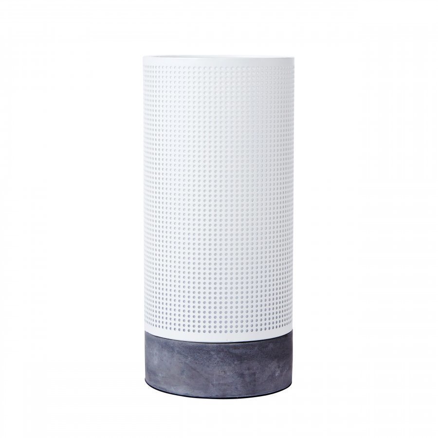 Sylinterin muotoinen pöytävalaisin, jossa on betoninen jalka. Valkoinen perforoitu metallivarjostin. Kanta E14. Max 40 W. Täydennä valonlähteellä.