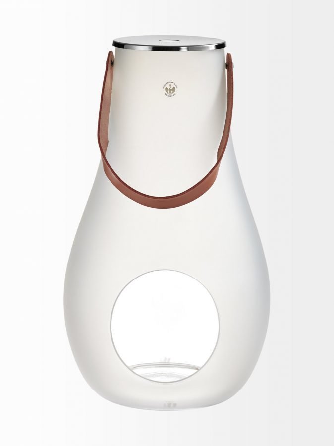 Siro ja elegantti lasilyhty on mattapintaista suupuhallettua lasia ja siinä on nahkainen ripustushihna. Lyhdyn suuta peittää irrotettava metallikansi. 45 cm korkean lyhdyn on suunnitellut Maria Berntsen. Käsinpesu.