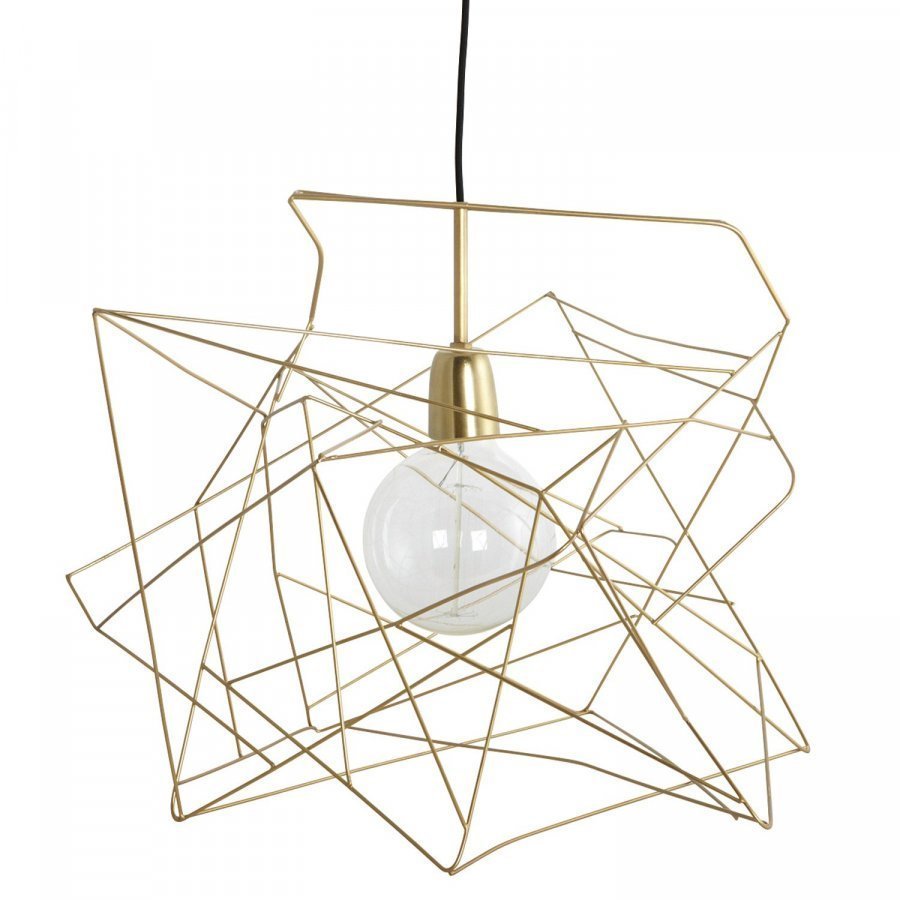 Asymmetric lampunvarjostin merkiltä House Doctor. Yksinkertainen ja tyylikäs varjostin geometrisellä designilla. Varjostin koostuu väännetystä metallilangasta, ja on muotoiltu kulmaiseksi palloksi. Varjostin on kullanväriseksi lakattua rautaa. Johto ja valonlähde ei kuulu hintaan.