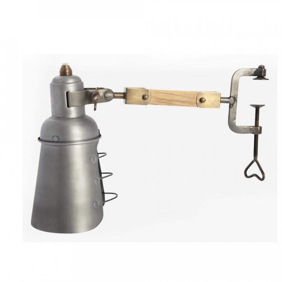 Valaisimessa teollinen muotoilu. Valaisin ruuvataan kiinni hyllyyn, pöytälevyyn tai vastaavaan.