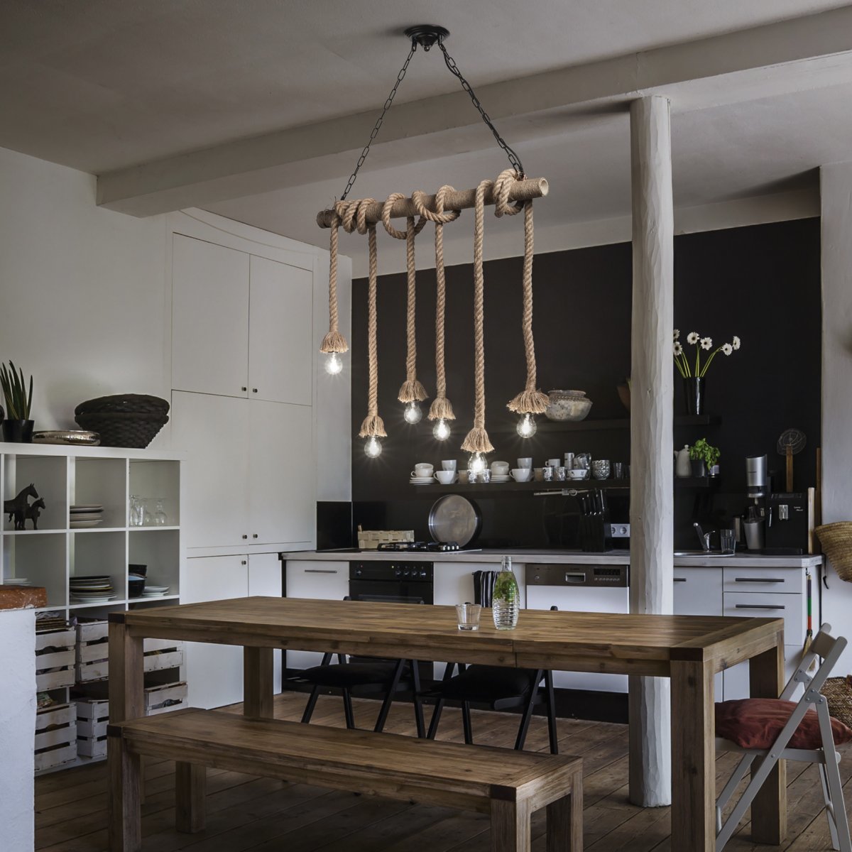 Upea merihenkinen köysivalaisin, voit itsekin asetella köydet eri korkeuksille. • Valoteho 6xe14 • Leveys 80cm • Korkeus 153cm • Kiinteä asennus • polttimosuosituksemme led 4w e14 el147-80922