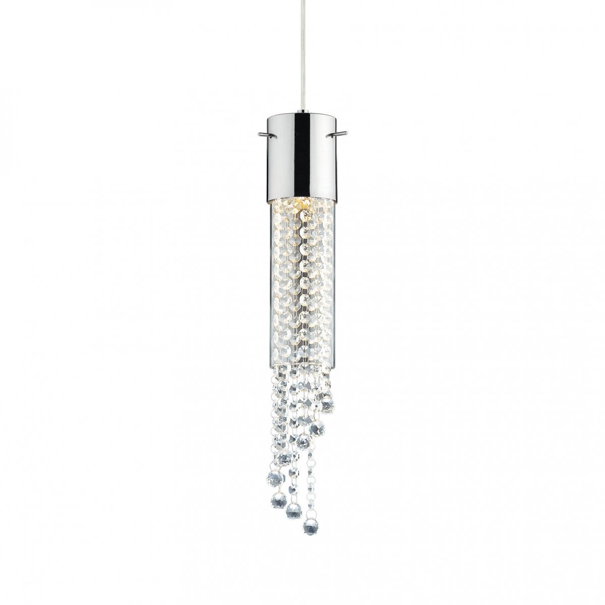 Loistokas kristallin kimallusta tuova riippuvalaisin. Pyöreän pyrex-lasin sisällä runsaasti lasikristalleja. Metalliosat kromattuja • Valoteho 1xgu10 (mukana 28w halogen •Halkaisija 11cm • Säädettävä korkeus max.132cm – min.40cm