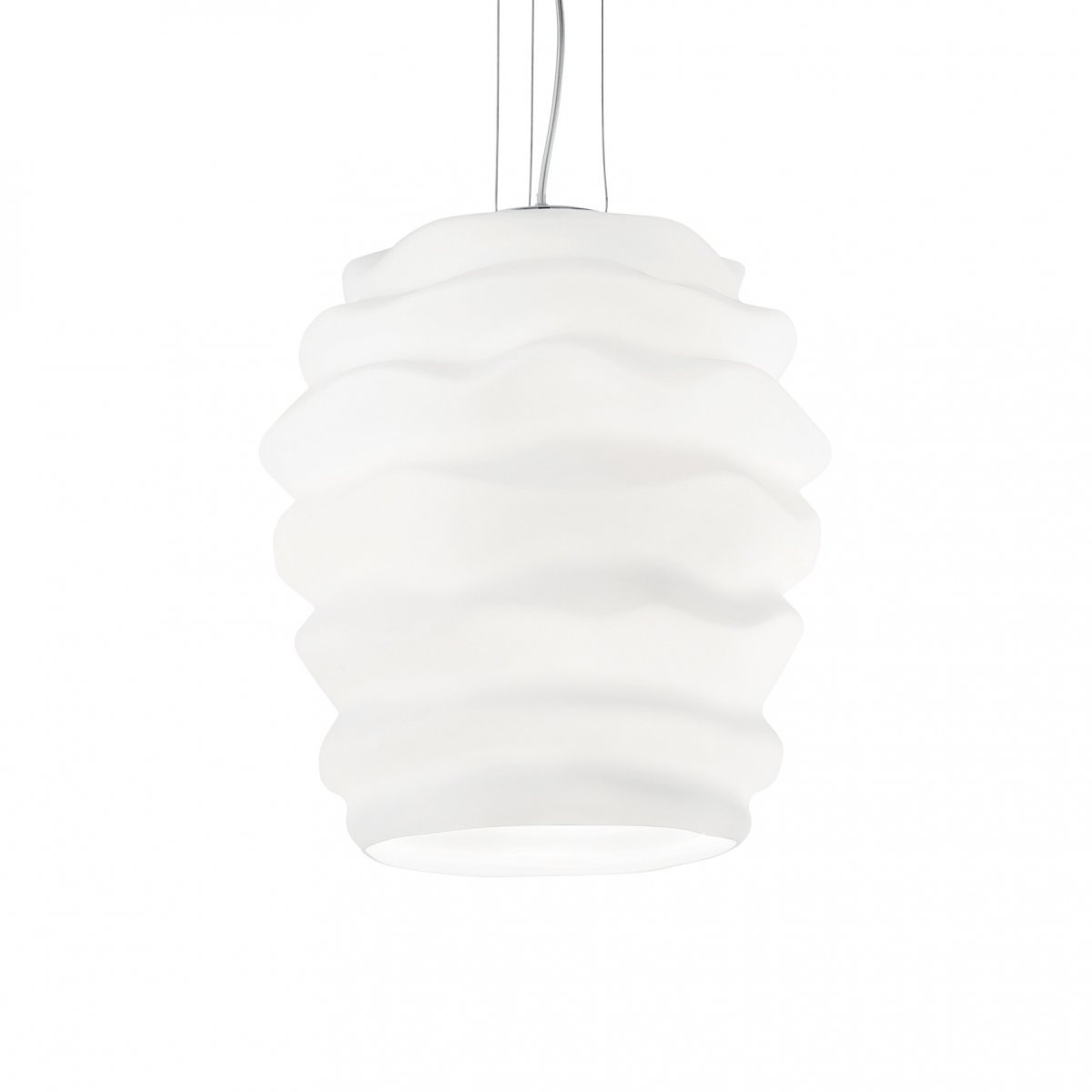 Tässä hienolla tavalla erilainen riippuvalaisin, valkoinen lasi on rypytetty upeasti. Lasi on alhaalta avonainen ja näin helpottaa polttimon vaihtoa. • Valoteho 1xe27 • Halkaisija 38cm • Säädettävä korkeus max.135cm – min.51,5cm