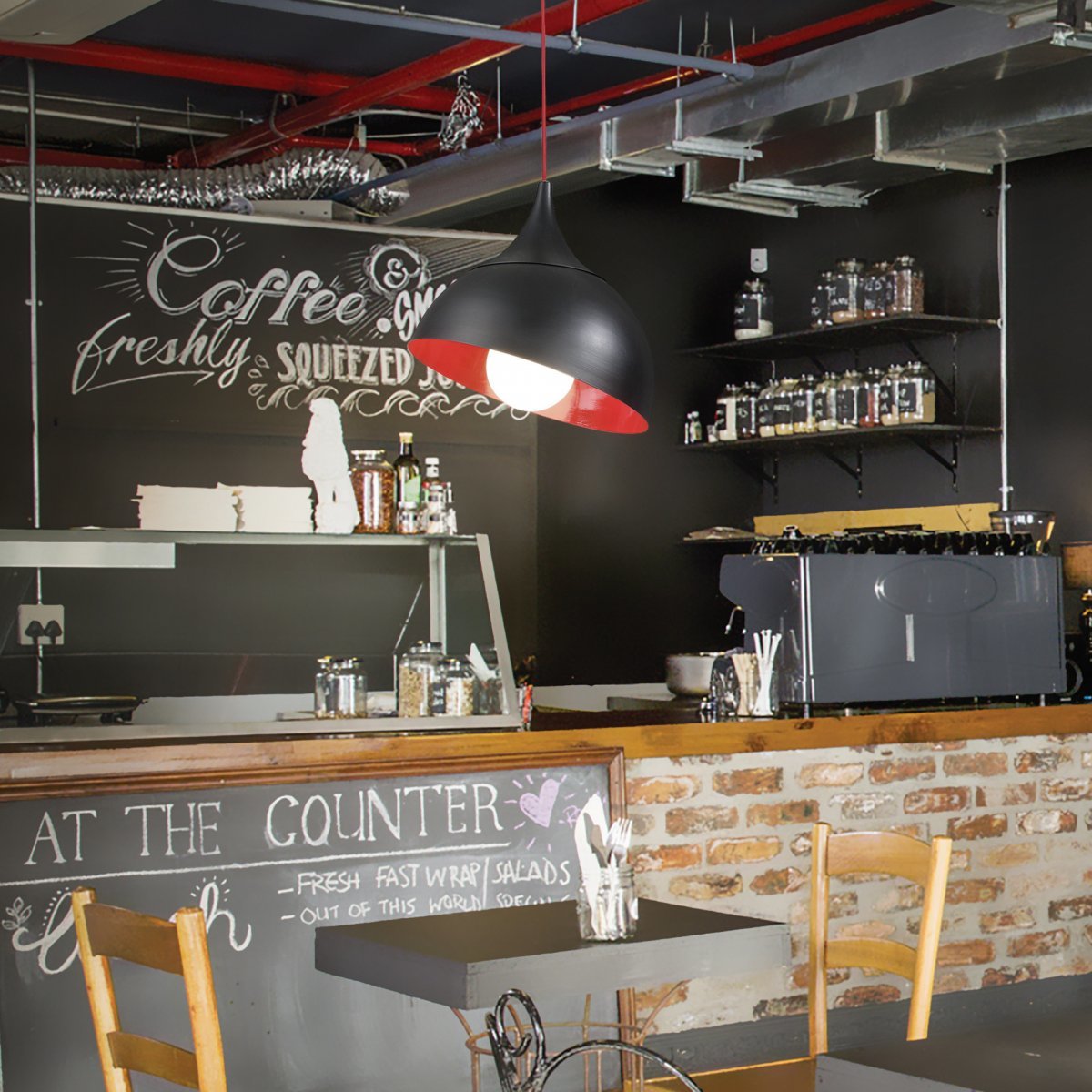 Upea metallinen riippuvalaisin jonka musta kupu heijastaa valoa viistosti alaspäin. Kuvun sisäosa ja kalustejohto ovat punaisia • Valoteho 1xe27 • Halkaisija 35cm • Korkeus max.150cm – min.45cm