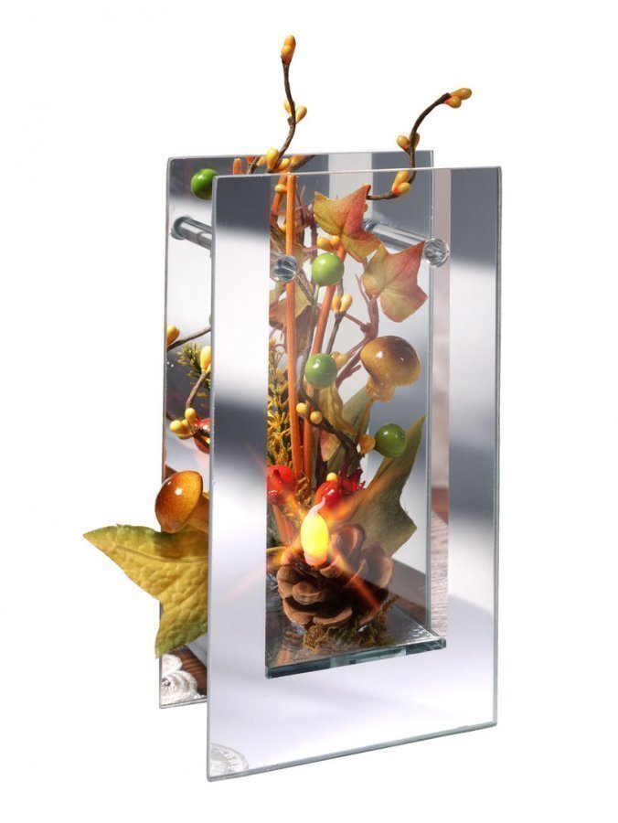 Moderni koriste-esine, jossa lasikehyksen sisään on asetettu LED-valaistus sekä kauniisti aseteltuja tekokukkasia. Materiaali lasia, polyesteriä ja luonnonmateriaalia. Valaistus toimii paristoilla, ja sitä varten tarvitaan kolme (3) LR44-nappiparistoa, jotka kuuluvat toimitukseen. Koriste-esineen mitat (K/L/S) n. 20/11/6 cm.