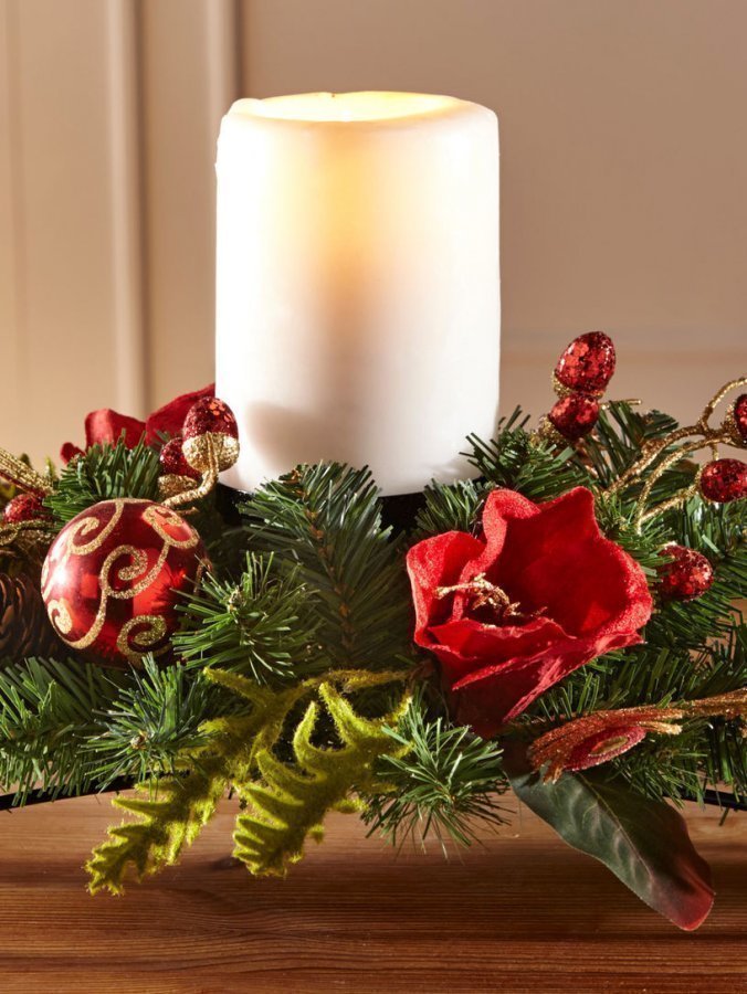 Jouluinen LED-kynttilä, jota ympäröi havukranssi. Somisteena joulupalloja ja punaisia koristekukkia. Kynttilä on paristokäyttöinen, 3x AAA (eivät sisälly toimitukseen). Mitat (KxLxS) n. 17 x 60 x 26 cm. Kynttilän korkeus n. 12 cm ja halkaisija n. 7 cm. Materiaalia polyesteriä, muovia, metallia.