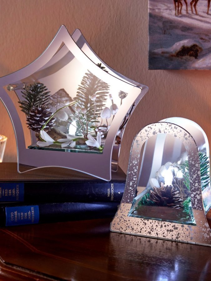 Koristeasetelma modernissa lasissa. Tyylikäs LED-valaistus. Paristokäyttöinen: 3x LR 44 (sisältyvät toimitukseen). Korkeus 19 cm, leveys 20 cm. Materiaali lasia, polyesteriä, muovia.
