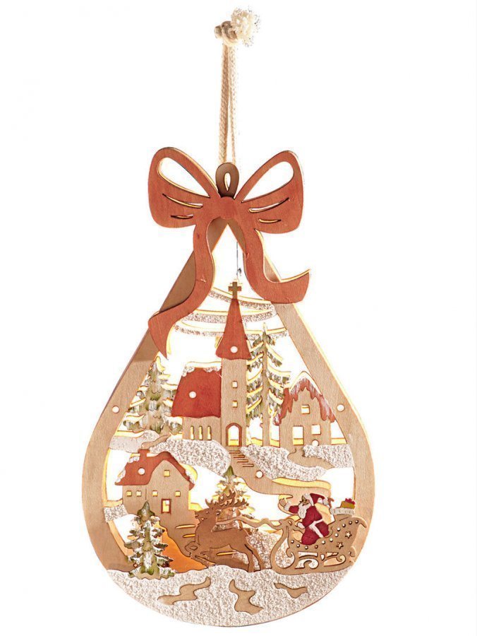 Kaunis puinen ikkunakoriste täynnä jouluisia yksityiskohtia. Koristeeseen on kuvattu talvinen kylämaisema, joka on valaistu tunnelmallista valoa hohkavilla ledeillä. KxLxS n. 31 x 19 x 4 cm.