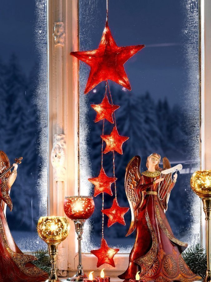 Jouluinen ikkuna- tai ovikoriste, jossa valaistuja tähtiä. Sarjassa 15 LED valoa. Materiaali metallia ja hamppua. Jouluinen tunnelman luoja.
