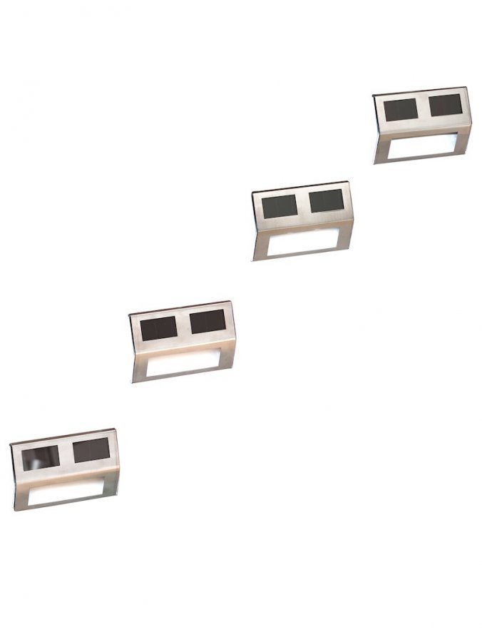 Tämä 4 kpl:n porrasvalosarja turvaa kulkusi portaissa. Valot ovat sekä tyylikkäät että erittäin kestävät. Johdottomat valot toimivat niin, että aurinkokenno latautuu päiväsaikaan ja siitä syntyvä energia tallentuu valoihin integroituun akkuun (AA, Ni-MH, 1,2 V, 300 mA). Erittäin kirkkaat LED-valot (10 000 mcd) syttyvät automaattisesti hämärän tultua integroidun valoanturin ohjaamana. Porrasvalot on helppo asentaa toimitukseen kuuluvien ruuvien avulla. Vinkki: valot soveltuvat myös kaiteiden valaisemiseen. K x L x S n. 9,5 x 14 x 2,4 cm. Materiaali jaloterästä ja polypropeenia.