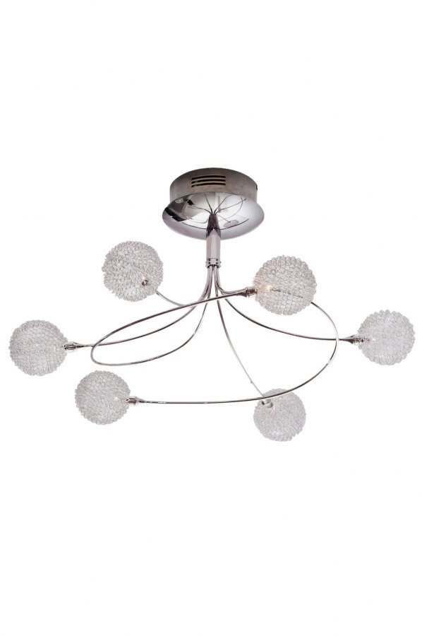 Kattovalaisimessa taivutetut varret, joiden päässä lasikuula. Runko metallia. Korkeus 30 cm, ø 56 cm. 6 x G4, enintään 1o W:n halogeenilampuille.