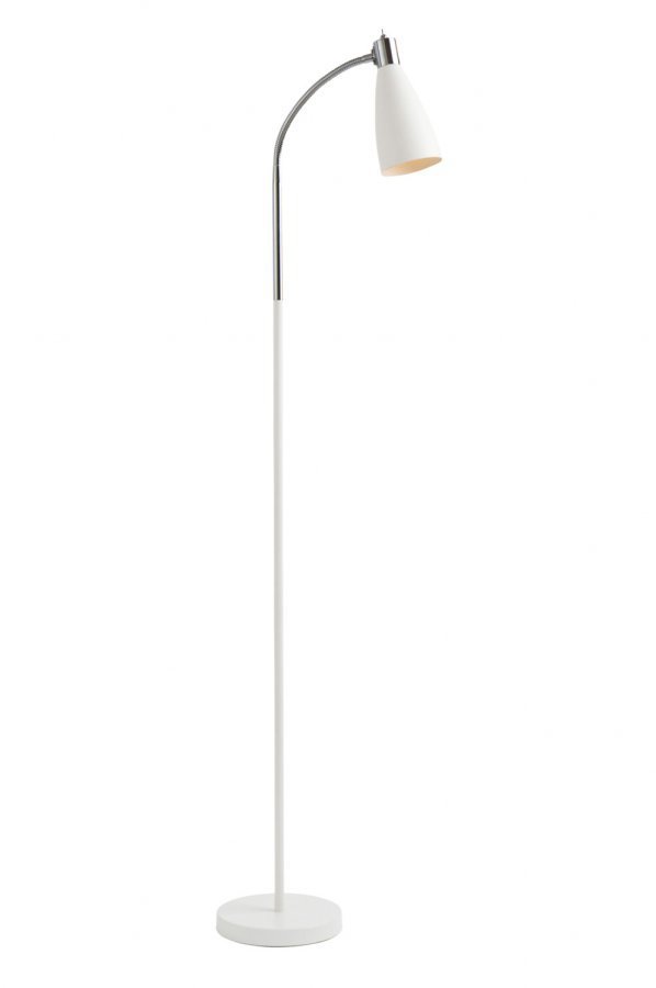 Kätevä lattiavalaisin, jossa säädettävä varjostin. Metallia. Korkeus 130 cm, ø 20 cm. Johdon pituus 170 cm. E14, enintään 11 W.