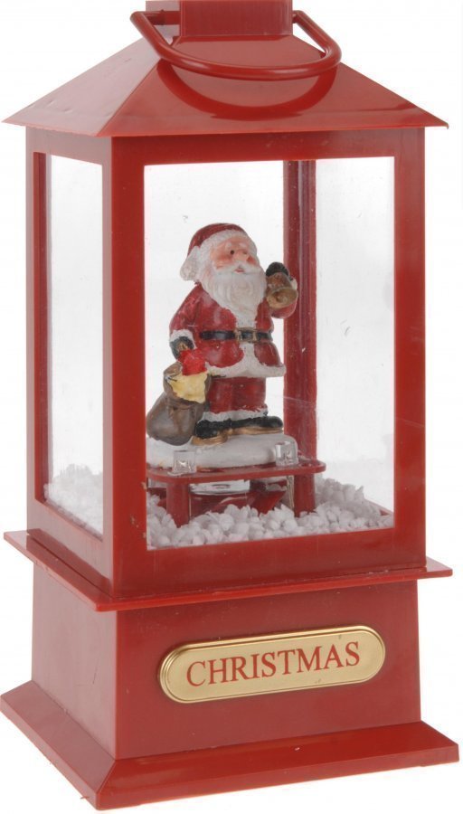 Joululyhty LED-valolla. Punainen tai valkoinen. Lyhdyssä musiikki ja lumiefekti. Toimii 3 x AA-paristoilla (ei sisälly pakkaukseen).