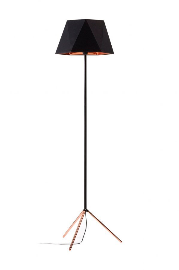Lattiavalaisin, jonka runko metallia. Lampunvarjostin mustaa kangasta, sisäpinta kuparinvärinen. Lamppu E27 (ei mukana). Korkeus 152 cm Leveys 45 cm Syvyys 45 cm