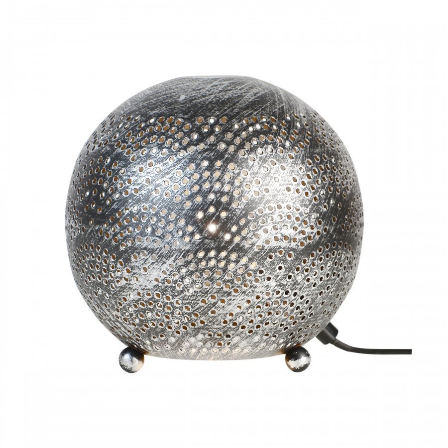 Pyöreä metallinen pöytävalaisin tuotemerkiltä Just Light. Kuvussa kaunis kolokuviointi. Johdossa kiinni katkaisija ja pistoke. Lampunkanta: E14 Max 40W.