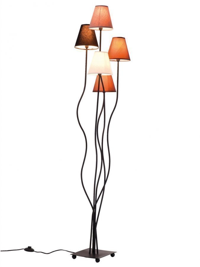 Trendikäs jalkalamppu, jossa on tyylikäs muotoilu. Lakattua terästä. Yhteensopivan lampun tehokkuusluokka A++E. 5x E14-lamppu, 40 wattia. Mitat KxLxS n. 163 x 40 x 35 cm.