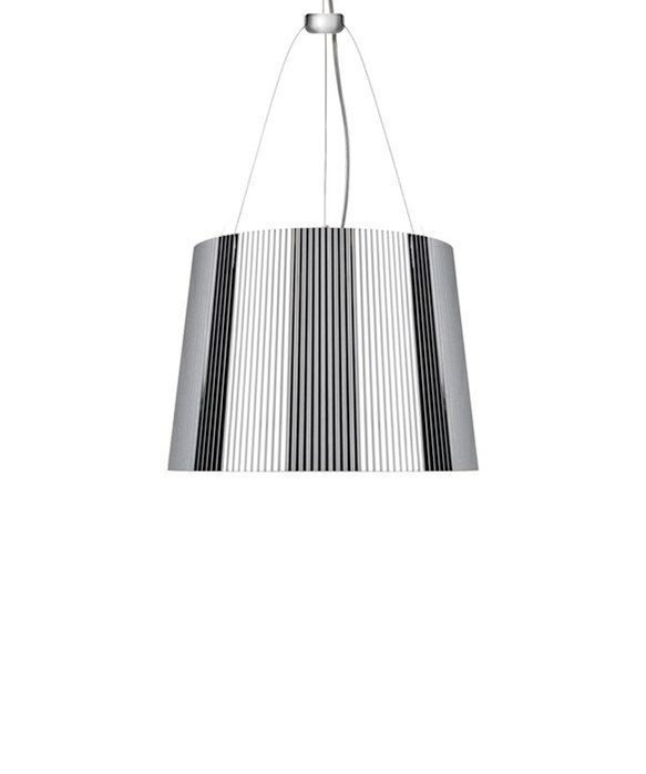 Design: Ferruccio Laviani for kartell. Konsepti: GE -riippuvalaisin ripustetaan kattoon käyttäen koristeltua polykarbonaatista valmistettua kattokupua, joka muistuttaa antiikkisia venetsialaisia kattokruunuja. Se toimitetaan halkaisijaltaan 37 senttimetrin kokoisen kokonaan polykarbonaatista valmistetun laskostetun varjostimen kanssa. GE -riippuvalaisinta on saatavilla kahtena eri versiona. Ensimmäinen tuo mukanaan läpinäkyvyyden tunteen ja on saatavilla pehmeissä ja hienostuneissa väreissä. Toinen tarjoaa klassista vaikutelmaa joko mustana tai valkoisena yhdistettynä kromiversion kultaiseen väriin. Johto on säädettävissä välillä 450-2300 mm.