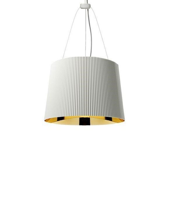 Design: Ferruccio Laviani for kartell. Konsepti: GE -riippuvalaisin ripustetaan kattoon käyttäen koristeltua polykarbonaatista valmistettua kattokupua, joka muistuttaa antiikkisia venetsialaisia kattokruunuja. Se toimitetaan halkaisijaltaan 37 senttimetrin kokoisen kokonaan polykarbonaatista valmistetun laskostetun varjostimen kanssa. GE -riippuvalaisinta on saatavilla kahtena eri versiona. Ensimmäinen tuo mukanaan läpinäkyvyyden tunteen ja on saatavilla pehmeissä ja hienostuneissa väreissä. Toinen tarjoaa klassista vaikutelmaa joko mustana tai valkoisena yhdistettynä kromiversion kultaiseen väriin. Johto on säädettävissä välillä 450-2300 mm.