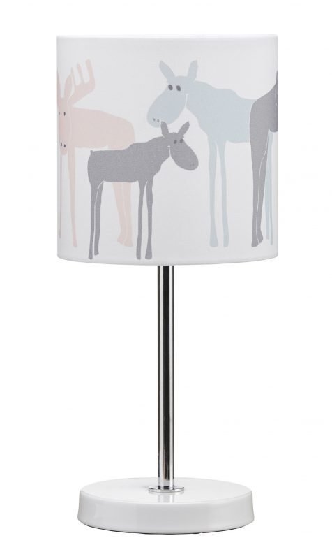 Kids Conceptin Edvin-pöytävalaisin luo huoneeseen pehmeän, tunnelmallisen valon ja sopii hyvin lastenhuoneeseen. Valkoisessa varjostimessa on hirviaiheinen kuvio, jossa pehmeät värit. Valaisimessa on valkoinen jalka. Valonlähde ei sisälly hintaan. Materiaali: tekstiili, metalli Leveys: 15 cm Korkeus: 33 cm Valaisimeen sopivat lamput, joiden energialuokka on: A++-E