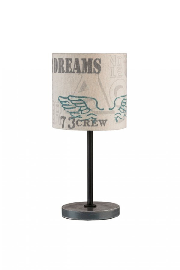 Kids Conceptin Industri-sarjan pöytävalaisin. Varjostin kanvaasia. Musta jalka. Sopii hyvin yhteen muiden Industri-sarjan tuotteiden kanssa. Valkoinen johto. Lamppu ei ole mukana. HUOM! Jalassa on kulunutta ilmettä tuovat haalistukset. Mitat: 15x15x33 cm. Materiaali: kangasta/metallia