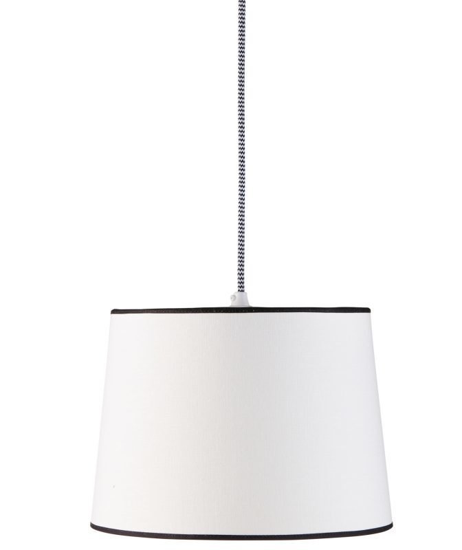 Kids Conceptin tyylikäs, mustavalkoinen Neo-kattovalaisin. Valkoisessa lampunvarjostimessa on musta ylä- ja alareuna. Lampussa on mustavalkoinen, siksakkuvioinen johto. Sopii yhtä hyvin lastenhuoneeseen kuin olohuoneeseenkin. Hehkulamppu ei sisälly. Materiaali: tekstiiliä, metallia Leveys: 20 x 30 cm Halkaisija: 30 cm