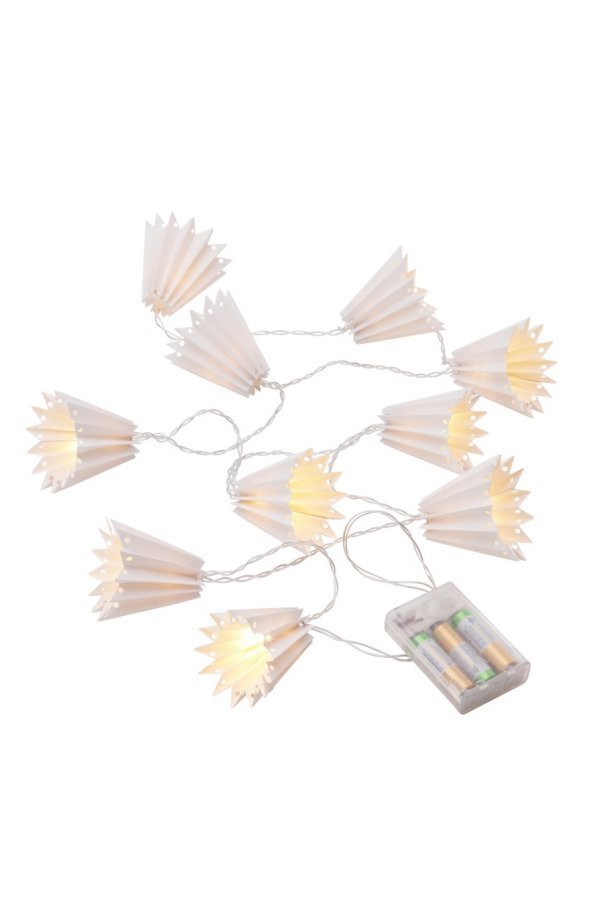 Juhlava valoköynnös, jossa taitellut paperikoristeet. Materiaali: Paperia. Koko: Korkeus 6,5 cm, ø 6,5 cm. Kuvaus: Valoköynnös, jossa paperista taiteltuja koristekartioita. 10 paristokäyttöistä LED-lamppua. Toimii kolmella AA-paristolla. Vinkki: Valoköynnökset valaisevat tunnelmallisesti läpi vuoden.