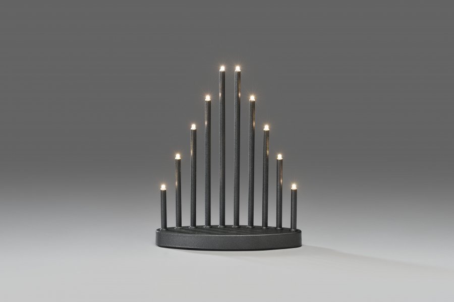 LED kynttelikkö sisäkäyttöön. Muuntaja 24V. 10 lämmin valkoista LED-lamppua, antrasiitin värinen metallikynttelikkö. Liitosjohdossa välikytkin.