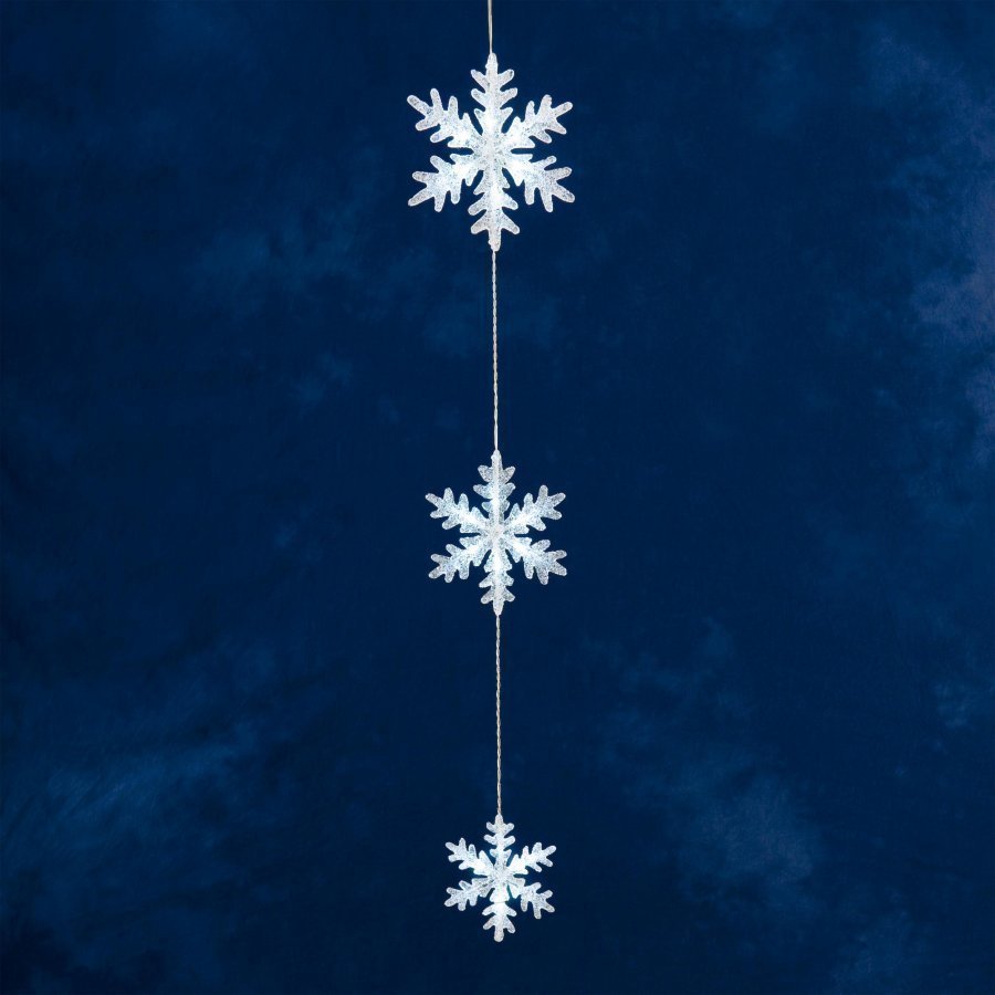 Kirkas akryylinen ikkunasomiste sisäkäyttöön, muuntajalla IP20. 3 kpl lumihiutaletta allekkain, yhteensä 15 valkoista LED-poltinta. Koristeen korkeus 60 cm, hiutaleet 13/17/21 cm. Kirks johto, pituus 5 m.