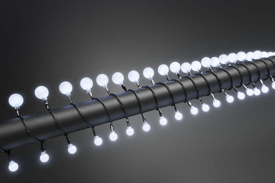 Konstsmide marjavalosarja 80 valkoisella ledillä ja mustalla kaapelilla. Joka toinen marjoista on iso ja toinen pieni. Marjojen väli 8 cm. Liitosjohdon pituus 5 m muuntajalla ja jouluvalosarjan pituus 6,32 m. Ulko- ja sisäkäyttöön.
