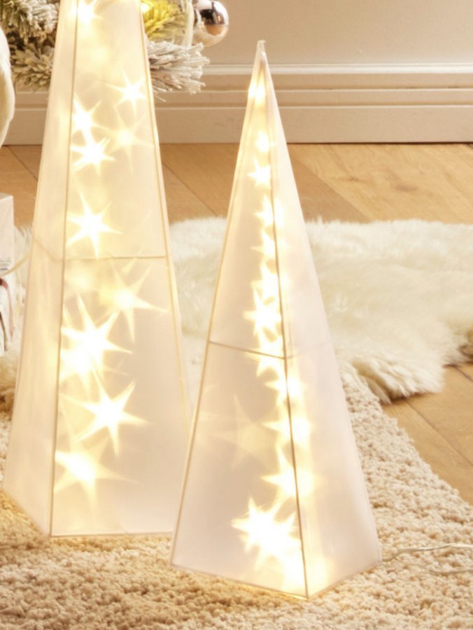 Ainutlaatuista joulun tunnelmaa tuova pyramidi, jossa tähtikuvioita ja 16 tai 32 lämpimän valkoista valoa luovaa diodia. Muovia. Pieni: K/L/S n. 45/14/14 cm, suuri: K/L/T n. 75/15/15 cm.