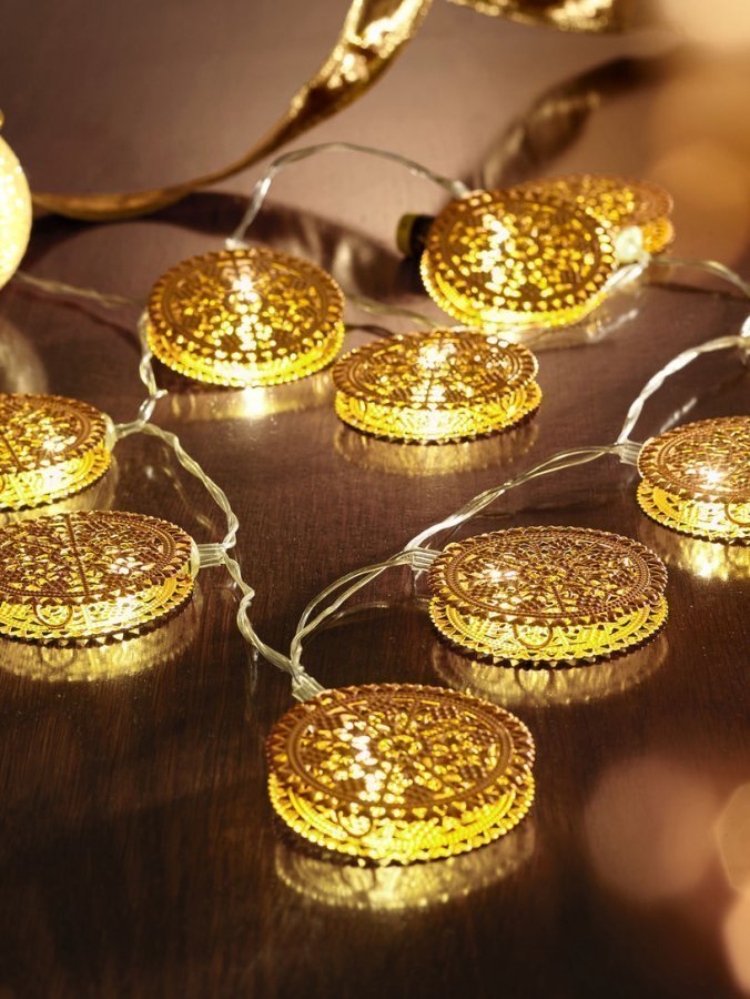 LED-valosarja, jonka valot on piilotettu koristeellisten metallilaattojen sisään. Sarjassa on 10 lämpimän valkoista lediä, ja valosarja toimii kolmella (3) AA-paristolla, jokta eivät sisälly toimitukseen. Valosarja on tarkoitettu sisäkäyttöön. Mitat (Ø/P) n. 6,5/120 cm, valojen välinen etäisyys n. 10 cm. Materiaali muovia ja metallia.