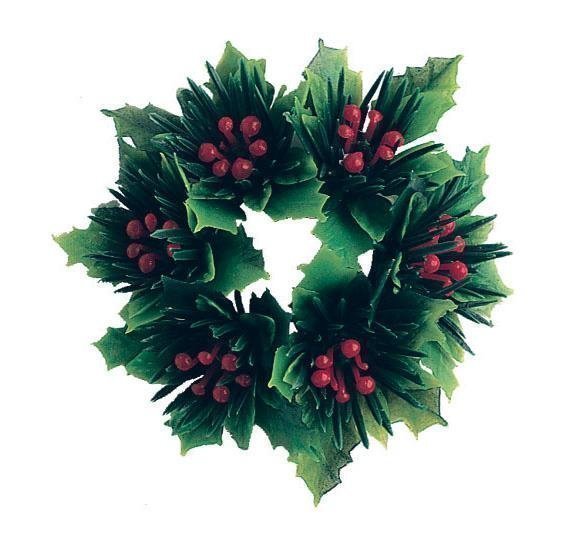 Kynttelkön koristemansetti, aiheena vihreät lehdet ja marjat. Muovia.
