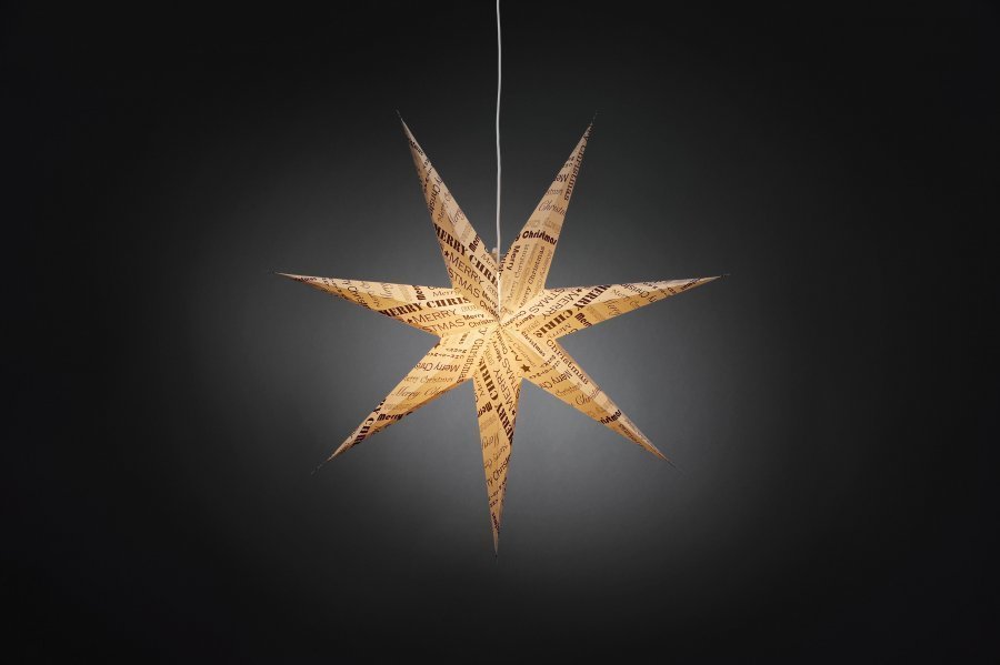Vaalea paperitähti sisäkäyttöön 230V. Aiheena sanomalehti ja kiinalaiset merkit. Sisältää ripustusjohdon 5 m