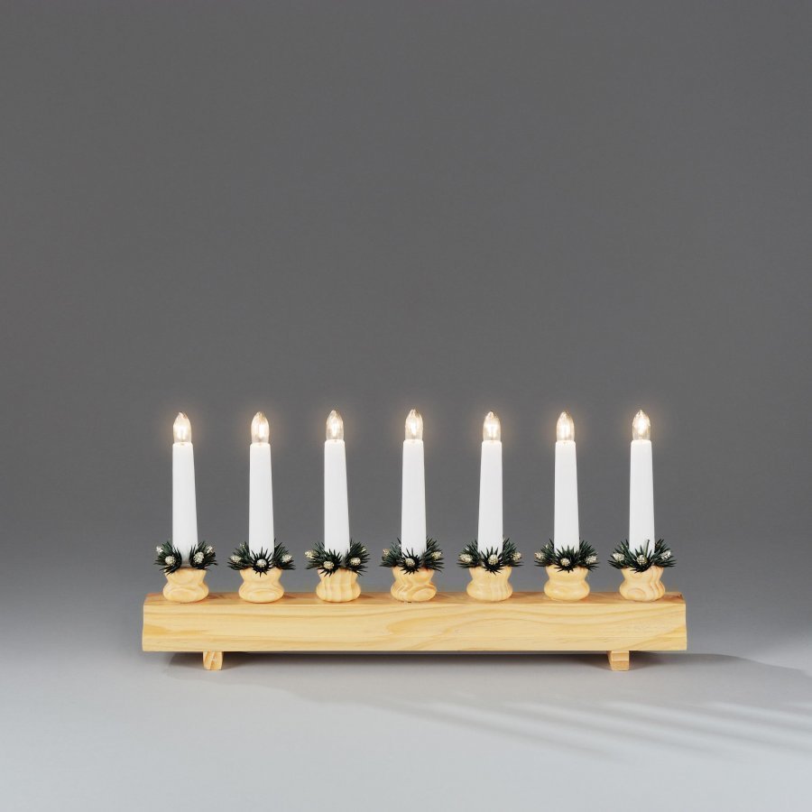Puinen kynttelikkö, punainen. Sisäkäyttöön. 7 kynttilää hehkulampuilla (34V), 230 V liitosjohto 1,8 m, välikytkimellä. Varalamppu 1042-030.