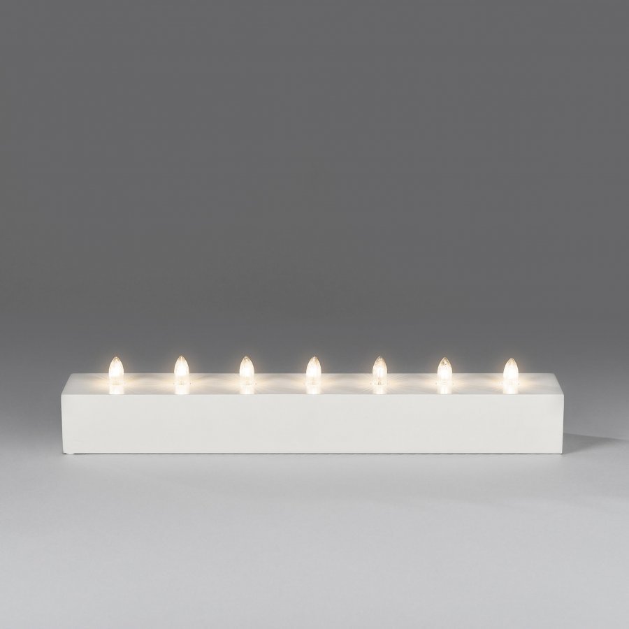 Valkoinen, puinen kynttelikkö jossa 7 hehkulamppua luovat kynttelikön pintaan kauniin kuvion. 230 V, liitosjohdon pituus 1,7 m. Välikytkin johdossa. Vaihdettava varalamppu 1042-030. Korkeus 8 cm, leveys 45 cm.