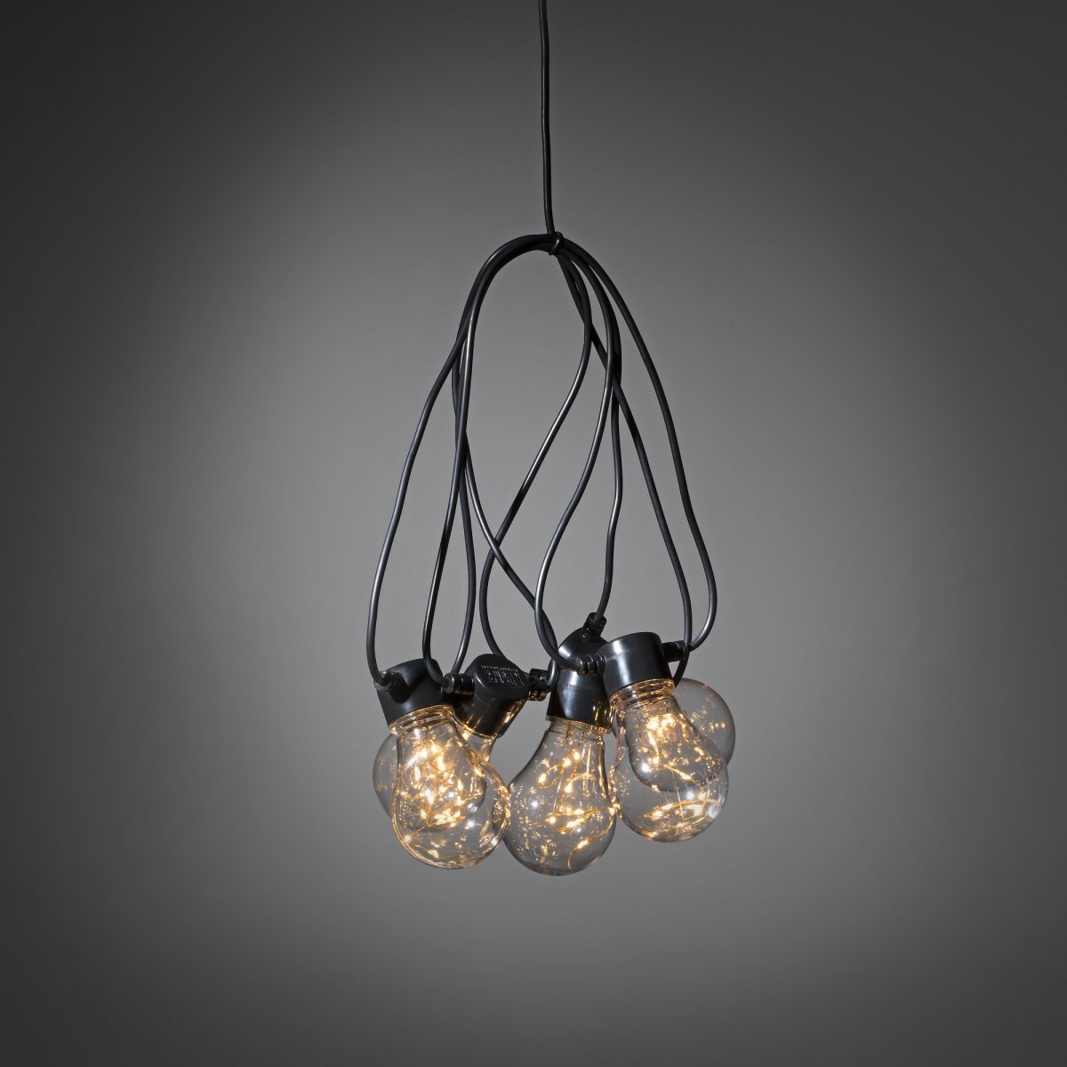 Valosarja 10 lamppua joissa jokaisessa sisällä 10 os. LED valolanka. IP 44 soveltuu ulkokäyttöön. – Musta kaapeli- Muuntaja- Lamppujen väli 50 cm- Liitosjohto 10 m