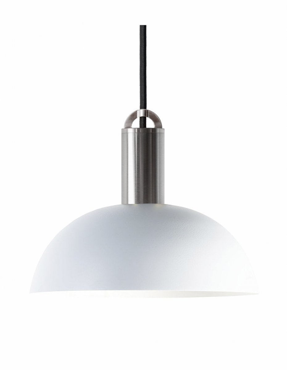Valkoisessa metallisessa kattovalaisimessa on kaunis hopeanvärinen lampunpidike.