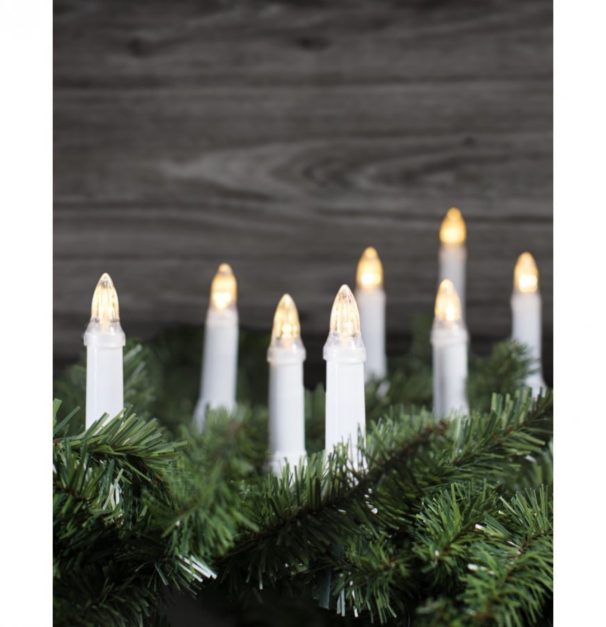 Verkkovirralla toimiva valosarja joulukuuseen, ulkokäyttöön. Lämpimänvalkoiset LED-valot on sijoitettu 12 metrin matkalle 80 cm:n välein, lisäksi sarjassa on 10-metrinen lähtöjohto. Verkkolaitteen suojausluokka IP44 (suojattu roiskevedeltä).