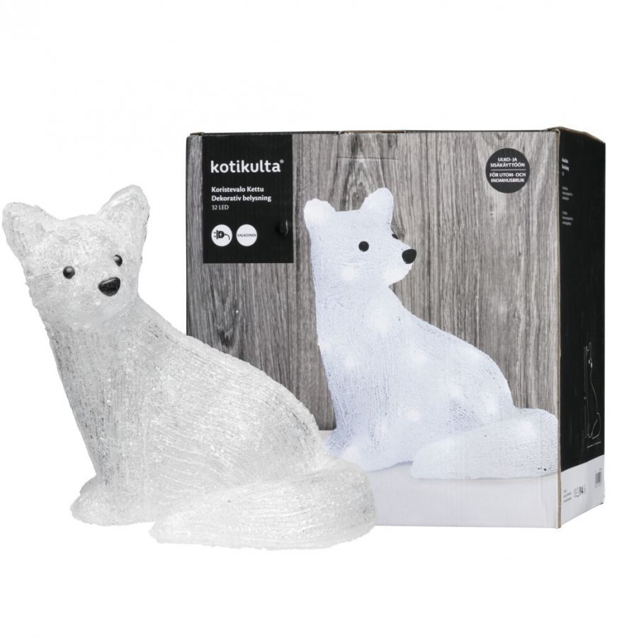 Valkoiset LED-valot saavat söpön pikkuketun hohtamaan kauttaaltaan. Valaisin toimii verkkovirralla, ja voit sijoittaa sen joko ulos tai sisälle. Pitkän virtajohdon ansiosta sopiva paikka ketulle löytyy helposti. Materiaali akryylia. Mitat (p x l x k): 31 x 21 x 30 cm. Johdon pituus 5 m. Verkkolaite 31 V / 3,6 W, suojausluokka IP44.