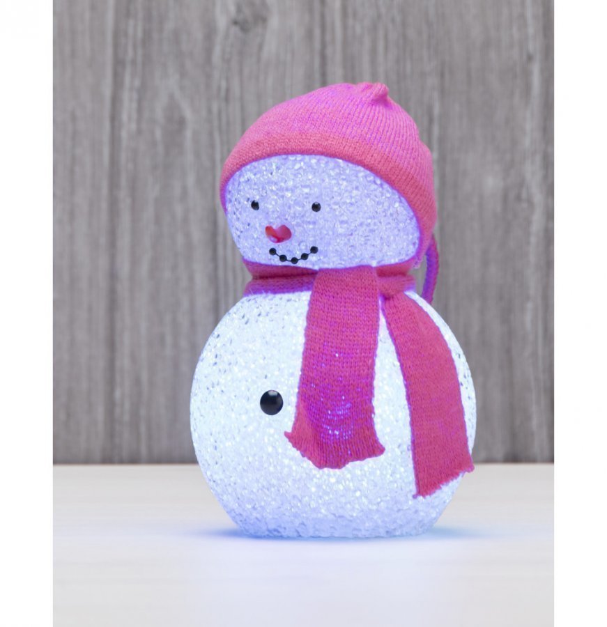 Lumiukon sisällä oleva paristokäyttöinen LED-valo vaihtelee hiljalleen värisävyään. Paristot (3 x AAA) eivät sisälly pakkaukseen. Mitat (&Oslash x k): 10 x 20 cm. Huom! Lumiukon asusteiden väriä ei voi valita verkkokaupasta tilattaessa, toimitus varastotilanteen mukaan.